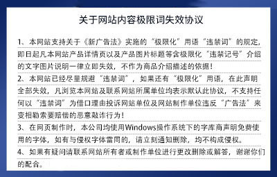 本公司全力支持關于《中華人民共和國廣告法》實施的“極限化違禁詞”相關規定,且已竭力規避使用相關“違禁詞”(如最,頂級,領先,第一,)等極限化詞匯。本公司于已經將網站上所有“極限化”違禁詞修改,如果還有遺漏修改的“極限化”違禁詞用在本公司網頁,本公司申明全部失效。所有訪問本公司網頁的人員均表示知悉,否則請放棄訪問。